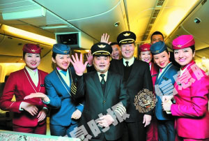 2012年南航最后一個航班飛機落地后,機組人員合影留念。信息時報記者 蕭嘉寧 攝