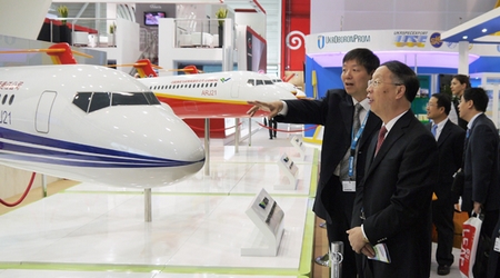 在中國商飛公司展區(qū),蘇波認(rèn)真察看了C919大型客機(jī)混合級布局以及ARJ21-700飛機(jī)混合級、全經(jīng)濟(jì)級、行政機(jī)和公務(wù)機(jī)布局模型,聽取了公司兩大型號的最新研制進(jìn)展、能力建設(shè)、人才隊伍建設(shè)、國際合作、民機(jī)產(chǎn)業(yè)體系建設(shè)等方面情況的匯報。蘇波表示,中國商飛公司成立5年來取得的成績令人鼓舞,工信部將一如既往地支持中國商飛公司的發(fā)展建設(shè),希望中國商飛公司再接再厲、奮力拼搏,爭取早日取得大型客機(jī)項目的成功。