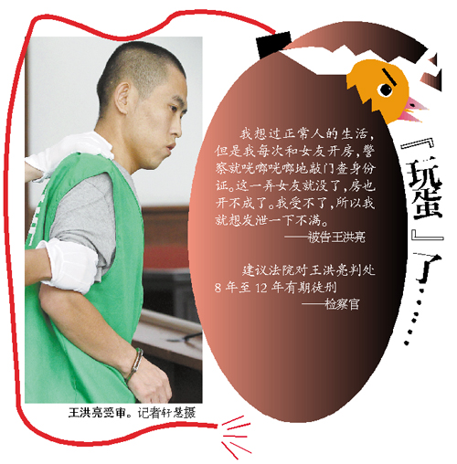 昨日,該案在深圳寶安法院開庭,被告王洪亮在法庭上認(rèn)罪,并自述犯罪動(dòng)機(jī):“我想過正常人的生活,但是我每次和女友開房,警察就咣啷咣啷地敲門查身份證。這一弄女友就沒了,房也開不成了。我受不了,所以我就想發(fā)泄一下不滿!