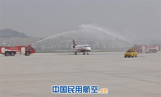 上圖為:飛機(jī)滑行中接受了大連國(guó)際機(jī)場(chǎng)給予的最高規(guī)格禮遇——水幕洗塵