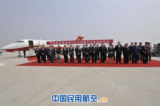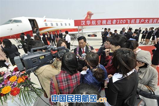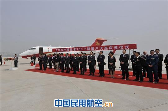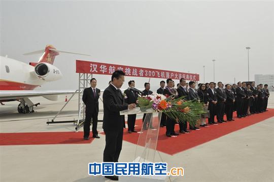 上圖為:漢華航空首架挑戰(zhàn)者300飛機(jī)落戶(hù)大連儀式現(xiàn)場(chǎng)