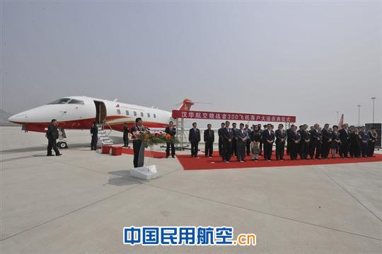 在歡迎儀式上,漢華公務(wù)機(jī)航空有限公司總裁楊建新、大連國(guó)際機(jī)場(chǎng)集團(tuán)有限公司副總經(jīng)理杜志淵、大連港口口岸局局長(zhǎng)高連分別致辭。楊建新總裁對(duì)各位來(lái)賓的光臨表示了熱烈的歡迎和衷心的感謝,漢華公務(wù)機(jī)航空有限公司首架挑戰(zhàn)者300型飛機(jī)的成功引進(jìn)并正式落戶(hù)大連,得到了民航東北地區(qū)管理局、大連市人民政府以及大連國(guó)際機(jī)場(chǎng)和其他各有關(guān)方面的大力支持協(xié)助,首架飛機(jī)的入列,標(biāo)志著漢華公務(wù)機(jī)航空有限公司進(jìn)入了新的發(fā)展階段,飛機(jī)投入運(yùn)營(yíng)后,公司將始終不渝地堅(jiān)持“安全第一,預(yù)防為主,綜合治理”的指導(dǎo)思想,堅(jiān)持高起點(diǎn)、高標(biāo)準(zhǔn)、嚴(yán)要求,確保飛行安全,努力將漢華航空打造成中國(guó)一流公務(wù)機(jī)航空服務(wù)品牌。大連市港口口岸局局長(zhǎng)高連在致辭中對(duì)漢華航空首架飛機(jī)的成功引進(jìn)表示熱烈的祝賀,對(duì)楊建新總裁為首的接機(jī)人員表示親切慰問(wèn),衷心希望漢華航空以此為起點(diǎn),不斷加強(qiáng)企業(yè)管理,苦練內(nèi)功,努力創(chuàng)造新的輝煌,將漢華航空打造成為大連市的一張靚麗的名片,為促進(jìn)東北亞航運(yùn)中心建設(shè)和帶動(dòng)其他產(chǎn)業(yè)發(fā)展作出應(yīng)有的貢獻(xiàn)。大連國(guó)際機(jī)場(chǎng)集團(tuán)有限公司副總經(jīng)理杜志淵在致辭中指出,漢華航空引進(jìn)的首架挑戰(zhàn)者300型飛機(jī)也是首架正式落戶(hù)大連的公務(wù)機(jī),是大連國(guó)際機(jī)場(chǎng)的一件大事,機(jī)場(chǎng)方面將不斷完善公務(wù)機(jī)運(yùn)行服務(wù)保障工作,為航空公司的安全運(yùn)營(yíng)積極創(chuàng)造有利的環(huán)境和條件。