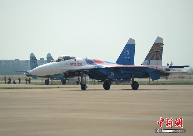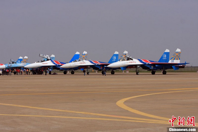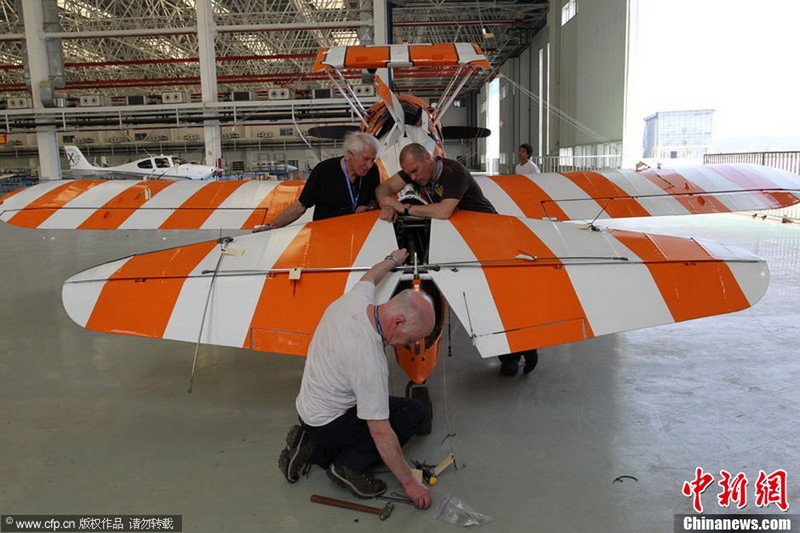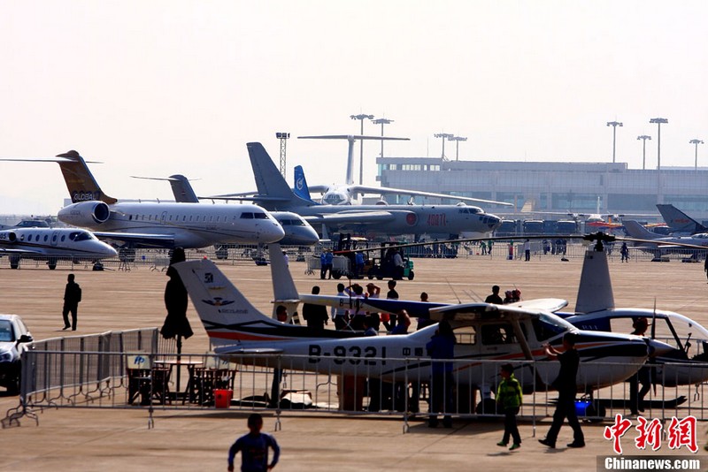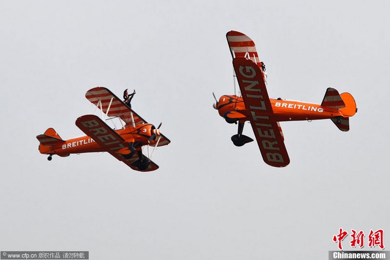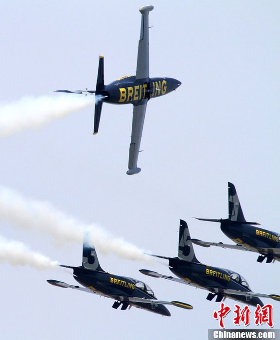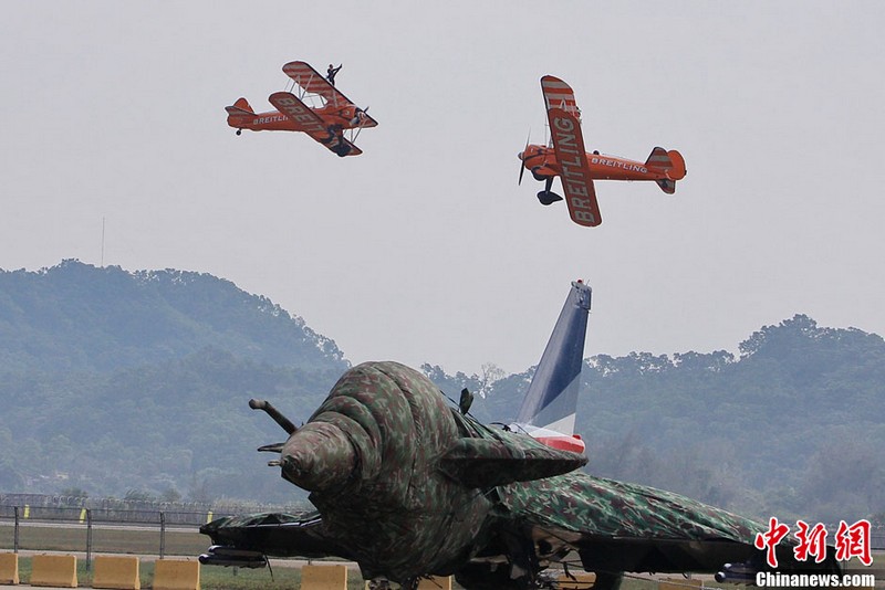 承辦中國航展的珠海航展有限公司副總經理楊賢剛介紹,第九屆中國珠海航展有來自39個國家和地區(qū)近650家中外航空航天廠商參展,根據最新的參展飛機清單,本屆航展上的各類飛行器實物將為114架,包括殲擊機、直升機、客機、公務機、水陸兩棲多用途飛機等,有近50架將動態(tài)飛行展示;飛行表演將集中在 11月16日-18日。圖為一臺被包裹得嚴嚴實實的“棕子機”,其上方則是“百年靈”機翼行走飛行特技表演隊在進行訓練。