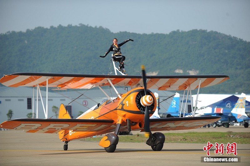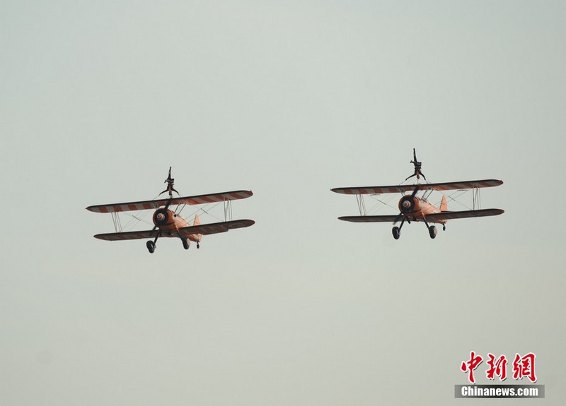 11月11日下午,歐洲“百年靈”機(jī)翼行走飛行表演隊(duì)表演了精彩的“云中漫步”。兩架飛機(jī)上各站有一名美女,在空中表演獨(dú)門舞步和雜技,隨飛機(jī)一起“云中漫步”,優(yōu)雅精準(zhǔn)!