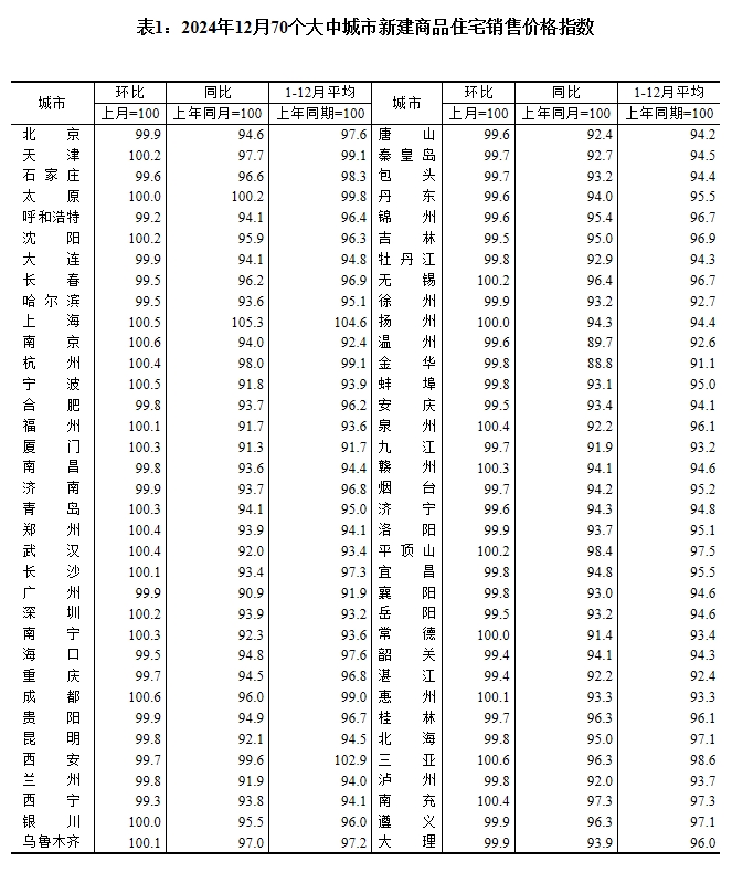 中國(guó)經(jīng)濟(jì)網(wǎng)北京1月17日(記者 李方) 17日,國(guó)家統(tǒng)計(jì)局發(fā)布2024年12月份70個(gè)大中城市商品住宅銷售價(jià)格變動(dòng)情況統(tǒng)計(jì)數(shù)據(jù)。數(shù)據(jù)顯示,2024年12月份,70個(gè)大中城市中,一線城市商品住宅銷售價(jià)格環(huán)比上漲,二三線城市環(huán)比總體降幅收窄;一二三線城市同比降幅均繼續(xù)收窄。