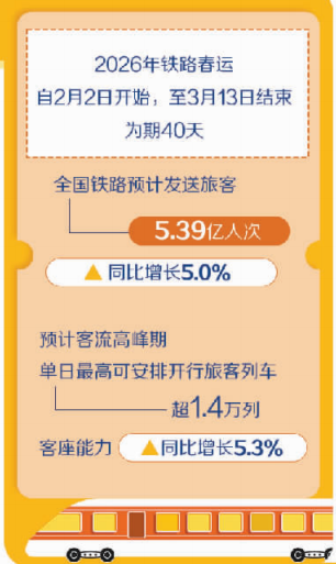 2026年鐵路春運(yùn)自2月2日開始,至3月13日結(jié)束,為期40天,全國鐵路預(yù)計(jì)發(fā)送旅客5.39億人次、同比增長5.0%,節(jié)前客流高峰日預(yù)計(jì)為2月13日(農(nóng)歷臘月廿六),節(jié)后客流高峰日預(yù)計(jì)為2月23日(農(nóng)歷正月初七)。