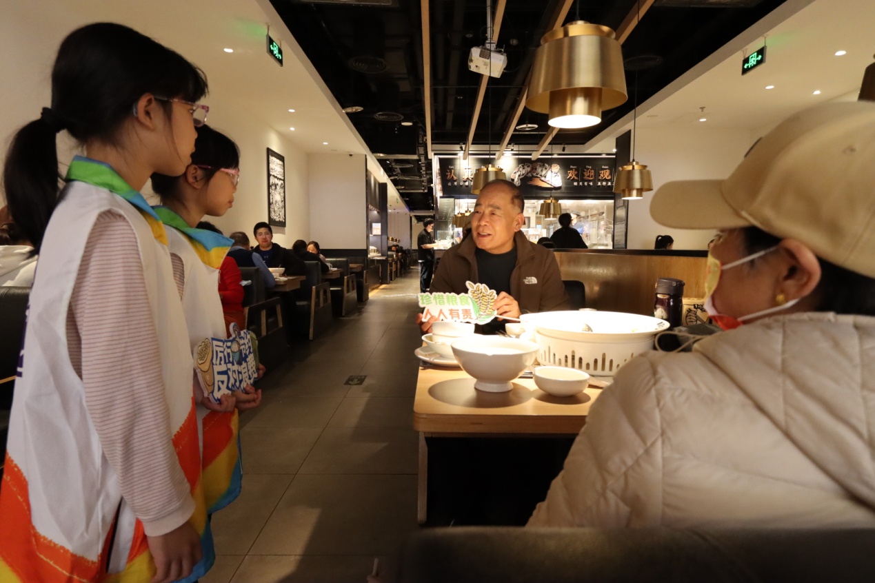 活動將科普與實踐相結合,青少年志愿者們學以致用,在實踐環(huán)節(jié)化身“制止餐飲浪費”宣傳員,向餐廳中的消費者宣傳節(jié)糧反浪費知識。