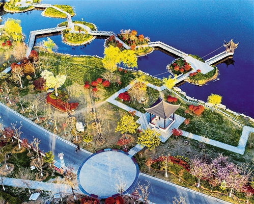4月7日拍攝的江蘇省連云港市東海縣水晶公園。近年來,東??h堅持走“生態(tài)優(yōu)先、綠色發(fā)展”之路,通過實施生態(tài)修復,河道、村莊綜合整治等多項管理機制,為當?shù)卮蛟炝恕氨趟{天、岸綠花香”的良好生態(tài)。
