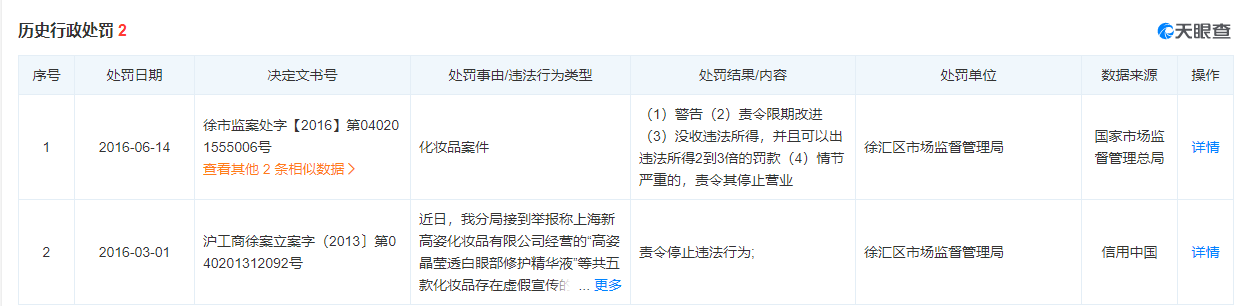 據(jù)天眼查,上海新高姿化妝品有限公司曾有兩次歷史行政處罰記錄,一次因添加了未經(jīng)審批的配方被警告,并沒(méi)收違法所得;一次因虛假宣傳,違反了《中華人民共和國(guó)反不正當(dāng)競(jìng)爭(zhēng)法》《上海市反不正當(dāng)競(jìng)爭(zhēng)條例》等相關(guān)法律被責(zé)令停止違法行為。