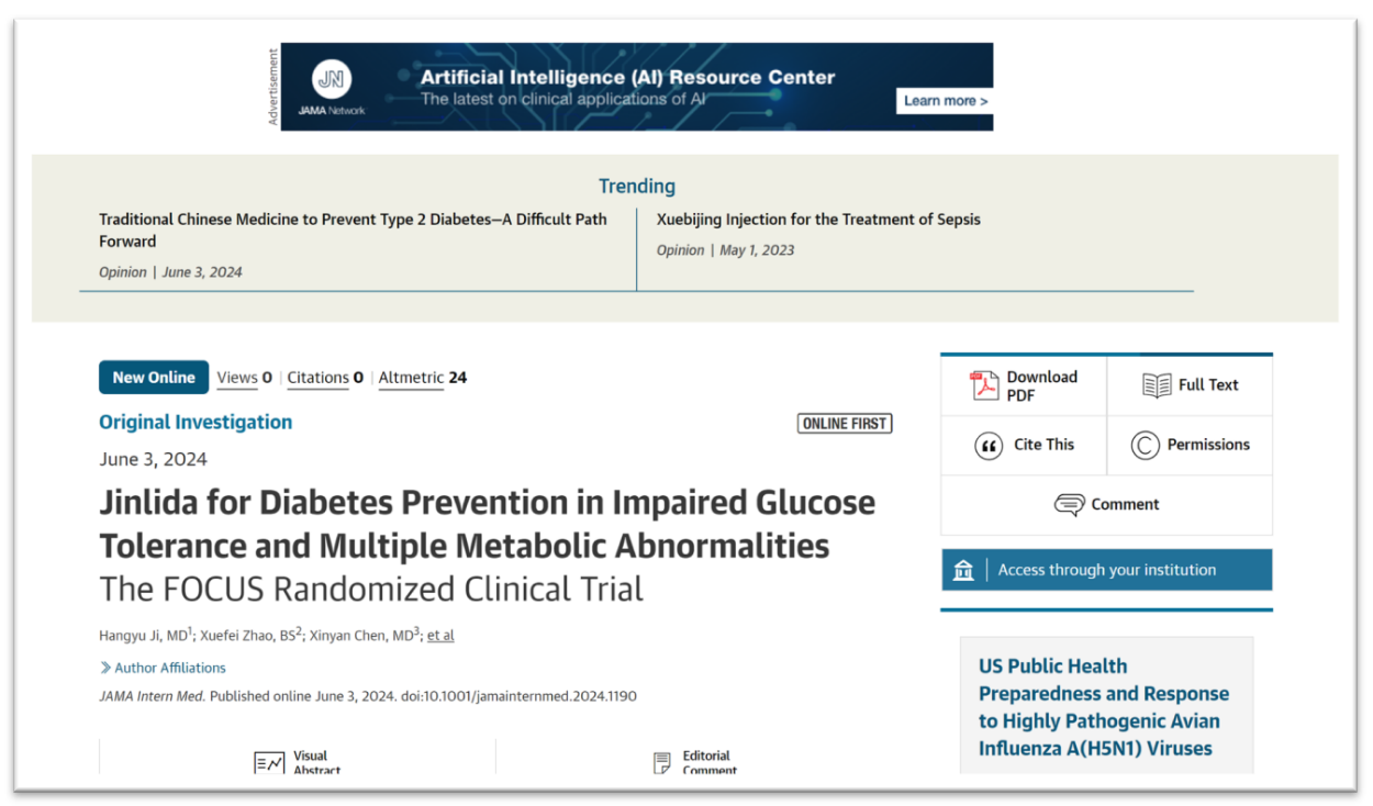 美國(guó)當(dāng)?shù)貢r(shí)間2024年6月3日,以嶺藥業(yè)生產(chǎn)的創(chuàng)新中藥津力達(dá)顆粒循證研究論文《津力達(dá)對(duì)糖耐量異常合并多代謝紊亂人群的糖尿病預(yù)防效果——FOCUS隨機(jī)臨床試驗(yàn)》在國(guó)際權(quán)威醫(yī)學(xué)期刊《美國(guó)醫(yī)學(xué)會(huì)雜志·內(nèi)科學(xué)》(JAMA Internal Medicine,影響因子39)發(fā)表。論文介紹了津力達(dá)干預(yù)代謝綜合征糖耐量異常人群取得的重大成果——津力達(dá)可降低糖耐量異常合并多代謝紊亂人群罹患糖尿病的風(fēng)險(xiǎn),為糖尿病的預(yù)防提供了新的視角和策略。