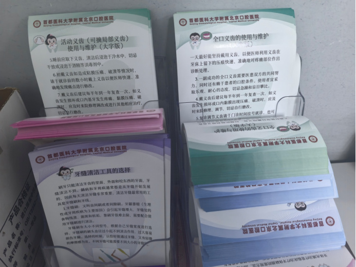 記者走進(jìn)北京口腔醫(yī)院門診樓,綠色的“老年咨詢臺”標(biāo)示映入眼簾。老年咨詢臺正前方走20米,左手邊便是老年口腔病科。順著黃色地標(biāo)徑直走約30米,便到達(dá)分診臺。上午的分診臺前,是患者最多的時候,詢問聲和指引聲交織,忙而有序。分診臺一角的老花鏡和大字版宣教彩頁引人矚目。護(hù)士告訴記者,這是為老年患者特意準(zhǔn)備的。“科室建的時間長,我們也準(zhǔn)備搬新院了,雖然地方有點局促,但該有的硬件都有?!?/p>