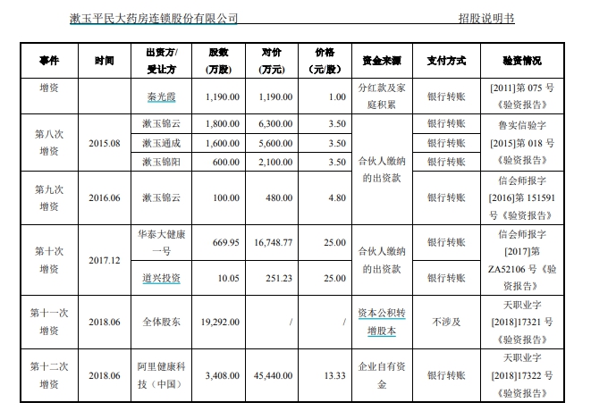 “V觀財(cái)報(bào)”查閱漱玉平民招股書(shū)發(fā)現(xiàn),2018年6月,漱玉平民股東大會(huì)通過(guò)決議,同意將注冊(cè)資本增加至36480萬(wàn)元。新增的注冊(cè)資本3408萬(wàn)元由阿里健康以45440萬(wàn)元認(rèn)繳,全部為貨幣出資。本次增資的價(jià)格為13.33元/股。