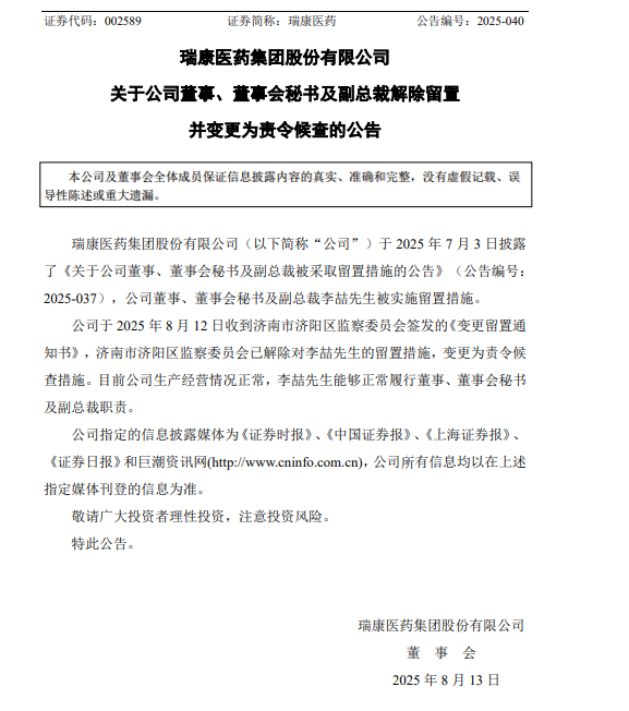 中國(guó)經(jīng)濟(jì)網(wǎng)北京8月15日訊(記者 郭文培)8月13日,瑞康醫(yī)藥集團(tuán)股份有限公司(以下簡(jiǎn)稱瑞康醫(yī)藥)披露公告稱,公司收到濟(jì)南市濟(jì)陽(yáng)區(qū)監(jiān)察委員會(huì)簽發(fā)的《變更留置通知書》,濟(jì)南市濟(jì)陽(yáng)區(qū)監(jiān)察委員會(huì)已解除對(duì)公司董事、董事會(huì)秘書及副總裁李喆的留置措施,變更為責(zé)令候查措施。