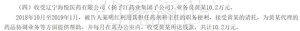 根據(jù)判決書,2018年10月至2019年1月,被告人某明紅利用其擔(dān)任藥劑科主任的職務(wù)便利,接受遼寧海悅醫(yī)藥有限公司(揚子江藥業(yè)集團子公司)業(yè)務(wù)員黃某的請托,為黃某代理的藥品協(xié)調(diào)業(yè)務(wù)等方面提供幫助,并每月在其辦公室內(nèi),收受黃某所送錢款,共計10.2萬元。