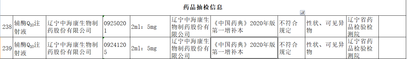 根據(jù)公告,該2批次不合格輔酶Q10注射液,標示生產(chǎn)企業(yè)為遼寧中??瞪镏扑幑煞萦邢薰荆a(chǎn)批號為09250201、09241205,規(guī)格為2ml:5mg,不符合項目為性狀、可見異物。