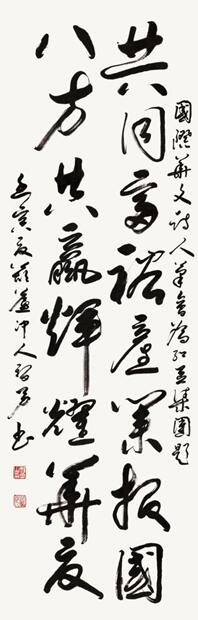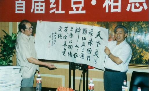 在《七夕,紅豆最相思的詩意探訪》論壇主題引導(dǎo)下,詩人們暢談紅豆愛情詩的淵源,以及對(duì)中國新詩的助推、發(fā)展的歷史作用,使中華文化傳統(tǒng)薪火相傳,在我們這一代詩人手里發(fā)揚(yáng)光大,繪出獨(dú)特的、現(xiàn)代人審美的愛情詩篇。會(huì)上,北京電視臺(tái)節(jié)目主持人、詩人黃殿琴朗誦了張?jiān)妱?、桂興華、綠島寫的紅豆愛情詩歌,并展示了多位詩人等為紅豆集團(tuán)寫的多幅書法,表達(dá)了友誼深情?!肮餐辉.a(chǎn)業(yè)報(bào)國 八方共贏輝煌華夏”是詩人黎勇先生寫給紅豆集團(tuán)的書法 ,國際華文詩人筆會(huì)主席張?jiān)妱懡o紅豆集團(tuán)書法為“紅豆最相思”等。
