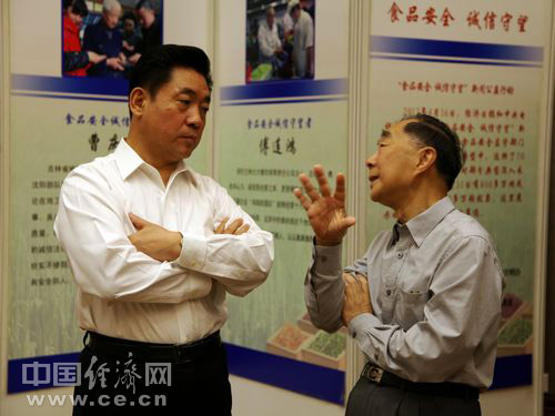 2013年全國食品安全宣傳周啟動儀式暨第五屆中國食品安全論壇6月17日在北京舉辦,今年主題為“社會共治 同心攜手維護(hù)食品安全”。圖為食品藥品監(jiān)管總局副局長劉佩智(左)和中國工程院院士陳君石參觀食品安全“誠信守望者”展覽。中國經(jīng)濟(jì)網(wǎng) 王耀峰/攝
